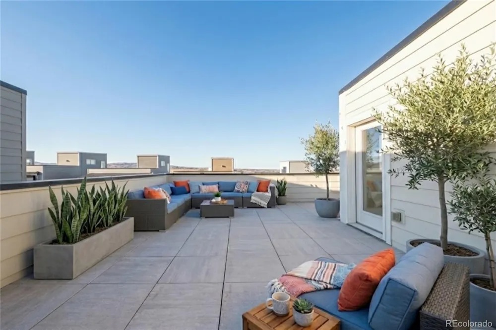 Modern design and thoughtful features come together in this light-filled home positioned close to the foothills, offering an ideal balance of outdoor access and city convenience. Expansive windows throughout the home bring in abundant natural light, creating an open and welcoming atmosphere across every level. The living room is wired for a sound system, making it easy to elevate everyday living or entertain with ease. The kitchen flows seamlessly into the living area, designed for both gathering and day-to-day use. The kitchen features a gas range cooktop, generous storage, seating space for bar stools, and room for a kitchen table. Step outside to enjoy multiple outdoor living areas, including a welcoming front porch, balcony, and an impressive rooftop deck with mountain and city views. The rooftop deck is equipped with a built-in gas valve, ideal for grilling or adding a fire feature. Additional highlights include a video security doorbell, a low-maintenance yard, and a location that places hiking and biking trails just minutes away. Downtown Denver is an easy drive, and convenient highway access makes commuting simple. This home offers a lifestyle defined by comfort, functionality, and proximity to Colorado’s outdoor amenities—all without sacrificing urban accessibility.