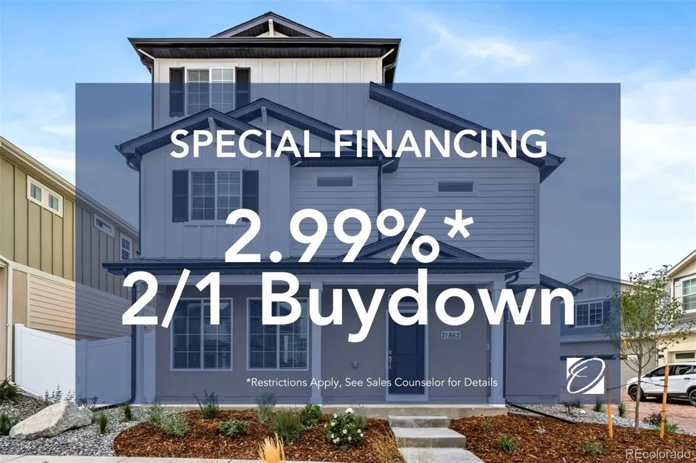 The Friesian, Modern Living in Green Valley Ranch Aurora-Take advantage of an introductory FHA rate of 2.99% on a 2/1 buydown. *Restrictions apply. See sales counselor for details*” The Friesian floorplan blends style with innovation in a home crafted for flexibility, affordability, and efficiency. This single-family, 3-story layout spans 1,944 sq. ft. and offers 3 beds, 2.5 baths, and an oversized 2-car garage with storage. This home is set on a private cul-de-sac with plenty of curb appeal featuring a multi-dimensional exterior, charming front porch, patio, and 5' privacy fencing. The interior is bright with oversized windows, 9' ceilings on the main floor, and an expansive "heart of the home" great room. Enjoy designer LVP flooring, Shaw carpeting, Whirlpool appliances, Delta faucets, and Sherwin-Williams paint throughout. The kitchen is complete with a dining island, designer countertops, and a stainless-steel sink. The spacious primary boasts a walk-in closet, double vanity, and spa shower with floor-to-ceiling tile and window. The expansive 3rd floor offers a versatile loft space perfect for your home office, game room or kids' playroom. This home is ready to move into within the next 30 days! All terms and conditions subject to credit approval as well as market conditions. Offer cannot be combined with any other incentives. Loan must be financed through preferred lender.