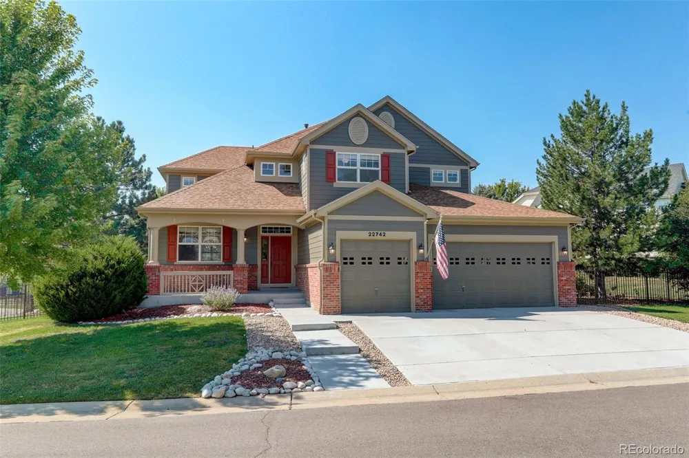 Welcome home to this impressive 4-bedroom, 4-bathroom home located on a desirable corner lot in the highly sought-after Saddle Rock community, within the Cherry Creek School District. Thoughtfully designed for both everyday living and entertaining, this home offers a spacious and versatile floor plan filled with plenty of natural light. The main level features a welcoming living room, a private office, and a generous family room with a 2-sided fireplace, providing multiple spaces to gather or unwind. At the heart of the home is the open kitchen, complete with abundant cabinetry, ample counter space, and a large island that is only steps from the dining room—perfect for casual meals or hosting guests. Step outside to the impressive, covered deck and enjoy the beautifully manicured lawn, ideal for relaxing or entertaining in a peaceful outdoor setting. The home also boasts a 3-car garage with epoxy floors, adding both style and functionality. Upstairs, the primary suite serves as a true retreat with a luxurious 5-piece en-suite bath and a spacious walk-in closet. A guest bedroom with its own en-suite bathroom offers comfort and privacy for visitors, while the additional bedrooms and bathrooms provide flexibility for a variety of lifestyles. Conveniently located near Southlands Mall, shopping, dining, E-470, and everyday amenities, this home combines an exceptional location with comfortable, refined living. Don’t miss the opportunity to make this Saddle Rock gem your next home!