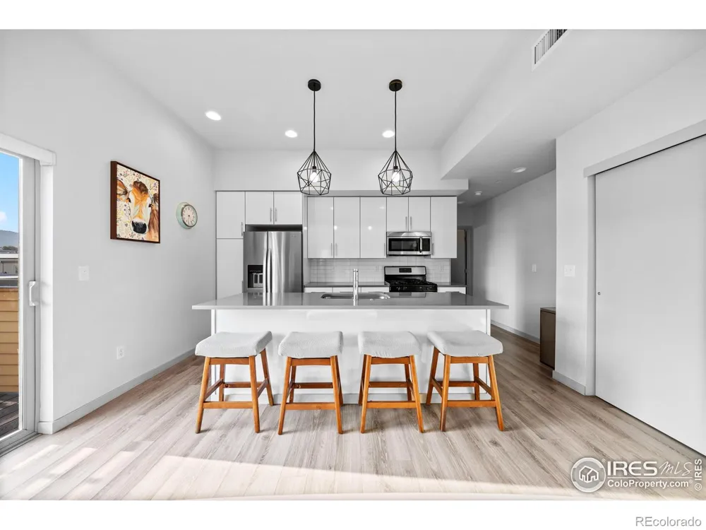 Located in a stunning boutique building in Central Boulder, this top-floor residence is the essence of modern living. The secure, elevator-serviced home features views of Flatiron and the surrounding foothills from a private balcony. Abundant natural light, contemporary finishes, and a thoughtful design complement the space and seamlessly tie together each room. The gourmet kitchen features sleek cabinetry, a large center island with ample seating, stainless steel appliances, and convenient proximity to the living and dining spaces. A spacious primary suite boasts a walk-in closet and ensuite bathroom with dual vanities. A secondary bedroom serves as flexible space, perfect for a guest room or home office. For optimal convenience, residents enjoy amenities including in-unit laundry, a dedicated covered parking spot, and storage units available within the building. Ideally situated in one of Boulder's most walkable and vibrant neighborhoods, this modern retreat is steps from retail shops, restaurants, cafes, and miles of bike and nature trails.