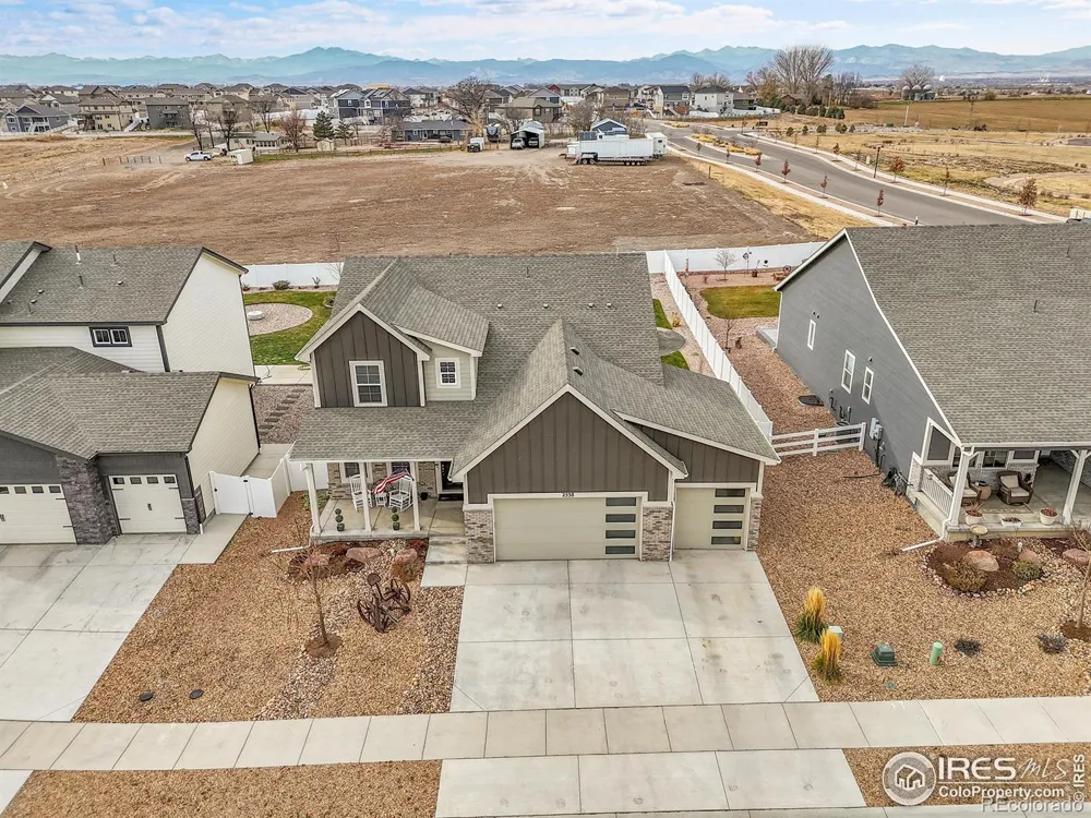 The Meadow Porch House. Perfectly placed in a quiet, friendly neighborhood, this inviting home welcomes you with a xeriscaped front yard and a charming front porch made for slow mornings and evening unwind time. Inside, the open kitchen-family-dining layout creates effortless flow for everyday living and entertaining. The kitchen is a standout with a breakfast bar, gas range with dual ovens, granite countertops, and a generous walk-in pantry. The backyard is truly exceptional-expansive, private, and framed by beautiful mountain views. Backing to open farmland, it offers a serene sense of space rarely found nearby. An attractive permeable paver patio sets the stage for outdoor dining, gatherings, and Colorado sunsets. Upstairs, two secondary bedrooms feel bright and spacious with large closets and natural light. The primary suite captures more of those mountain views and features a massive walk-in closet and a luxe en-suite bath. An unfinished basement offers incredible storage and future potential. With easy access to I-25 and everyday conveniences just minutes away, this is a special opportunity to enjoy comfort, views, and room to grow-all in a coveted location.