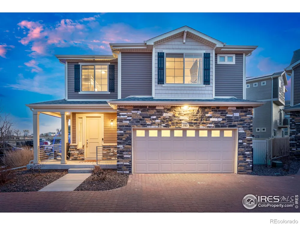 OPEN HOUSE THIS SUNDAY THE 1ST FROM 12:00 - 2:00PM!! This beautifully maintained home situated on a desirable corner lot with charming curb appeal, featuring a welcoming front porch and a stylish siding and rock exterior. Inside, the open and bright main level showcases luxury vinyl plank flooring, white trim, and elegant 6-panel doors throughout. The kitchen is designed for both function and style with granite countertops, stainless steel appliances, crisp white cabinetry, and a large island perfect for entertaining. The living room is complete with a tray ceiling, creating an inviting atmosphere.Upstairs, the primary suite features a walk-in closet and private 3/4 bath with a double vanity and tile shower. The second bedroom offers a walk-in closet and inviting window seating, complemented by a full guest bath on the upper level. A convenient half bath is located on the main floor. Enjoy low-maintenance living with an HOA that includes access to two community pools, fitness gym, front landscaping maintenance, non-potable water and snow removal on driveway and sidewalk over 2" of snow. This home offers comfort, style, and convenience in a fantastic location! The community features scenic trails, a playground, and a basketball court, and is conveniently located just one block from Riverview Pre-K-8.