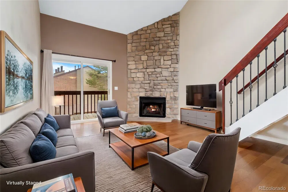 Spacious and inviting, this 2-bedroom, 2-story condo with an upper loft is nestled in the desirable Telluride West Condos of Lakewood. Enjoy a prime location with easy access to the mountains, popular restaurants on Union Blvd, RTD Light Rail, and St. Anthony Hospital. The living room boasts soaring vaulted ceilings and a cozy wood-burning fireplace with a stunning floor-to-ceiling natural stone surround. The versatile loft is perfect for a home office. The kitchen features warm wood cabinetry, modern appliances, and sleek laminate countertops. Two generously sized bedrooms share a full bath, with the primary offering a nice walk-in closet. Additional conveniences include in-unit laundry and a private balcony with extra storage. This home offers fantastic amenities including assigned parking, a clubhouse, a pool, and tennis courts. Recent upgrades include a new refrigerator (9/16/24), dishwasher (10/10/24), 40-gallon natural gas water heater (9/14/24), garbage disposal (11/23/23), Samsung front-load washer & dryer (7/7/21), and a GE 30" electric range (2/13/19). Move-in ready!