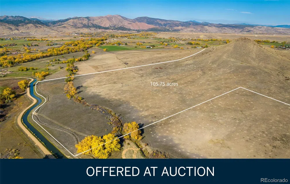 AUCTION BIDDING OPEN: Bidding ends September 24th. Previously Listed $8.9M. Current High Bid $6.2M. Showings Daily By Appt. Offered as a whole, this 105-acre parcel includes 31 shares of Left-Hand Ditch Water and Mineral Rights. The property also allows the new owner the option to create three 35-acre buildable parcels, all with no conservation easement(s). This property is a prime location to build a private residence with panoramic views of Longs Peak, the snowcapped back range, Boulder's Flatirons, and incredible long distance views overlooking Boulder County. Standing proudly in the shadow of the Rocky Mountains, welcome to this once in a lifetime opportunity to own an iconic feature of the Boulder County landscape, Haystack Mountain. Enjoy the peace and tranquility of country living along with convenient access to nearby amenities and easy commutes to downtown Boulder, Niwot, Longmont, and Denver International Airport. To participate in the auction go to https://www.conciergeauctions.com/auctions/haystack-mountain-5655-niwot-roadlongmont-colorado