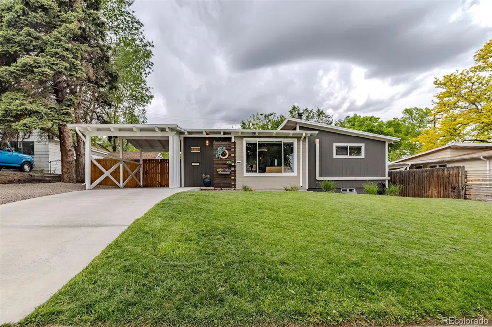 Welcome to this charming mid-century modern ranch home located in close proximity to Olde Town Arvada. Cathedral ceilings with rustic beams can be found throughout the main level, along with hardwood floors. The heart of the home lies in its updated kitchen, where sleek countertops and contemporary appliances meet classic design elements. Enjoy the warm ambiance of the charming 1950s fireplace, a focal point of the living area. Stainless steel appliances, a large island with room for a breakfast bar, eat-in space and a nice pantry complete the kitchen. Two sliding doors lead out to a large patio, providing seamless indoor-outdoor living and an ideal setting for entertaining guests or simply enjoying al fresco dining. Beyond the patio awaits a vast yard complete with a fire pit area, perfect for cozy evenings gathered around the fire. A large shed offers ample storage space for outdoor equipment, ensuring a clutter-free environment. On the main level, you'll find two well-proportioned bedrooms and a fully renovated bathroom with elegant updates. Find the right temperature for each of the main level rooms with the new ductless mini split heating and cooling systems. The finished basement enhances your living space, featuring a spacious family room and two bedrooms, each equipped with egress windows for safety and natural light. Indulge in the luxury of a meticulously renovated bathroom, complete with a spacious shower, double sinks, stunning tile accents, and an illuminated LED touch sensor mirror. There is a generously sized laundry room with cabinet space, folding counter, and washer and dryer set that will remain with the property. Take note of the spacious gear closet, fully equipped with pegboard for optimal organization and storage of your outdoor essentials. New drainage and supply plumbing installed recently. With its perfect blend of modern convenience and timeless charm, this home offers a welcoming retreat for both relaxation and entertainment.