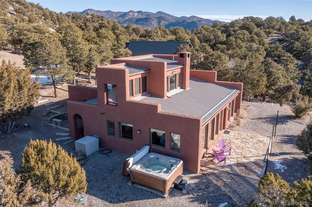 Beautiful energy efficient southwest-style home on 39 +/- acres, 25 minutes from Salida. This secluded, south-facing home takes in magnificent mountain views. Ideally situated for solar gain in the winter months, the home also features 16" concrete walls for extra energy efficiency. The main house features a kitchen with granite counters, near-new appliances and breakfast bar. The kitchen opens onto a light-filled dining / living area with wood stove and tile floors that retain the warmth of the wintertime sun. The living area in turn opens on to a flagstone patio and hot tub for outdoor living and starry nights. A primary suite with 3/4 bath including walk-in shower and large walk-in closet, laundry and hallway access to an oversized one car garage rounds out the main level. Upstairs is a second bedroom with beetle kill floors, 3/4 bath and screened- in porch for taking in the Sangre de Cristo views. The detached oversized two car garage with guest quarters also boasts a bar and game room with pool table for entertaining. Above the garage and game room is a generous apartment / living area with kitchenette, 3/4 bath and south facing deck and second laundry. Also included is a 50 amp RV hook up and propane-powered back up generator. An 8.68 kw net meter solar system ensures energy efficiency. The 39+/-acre lot has approx 5 miles of private trails for hiking and biking. Public access to the Arkansas River is 5 minutes away. The property has been used as a successful vacation rental in the past.