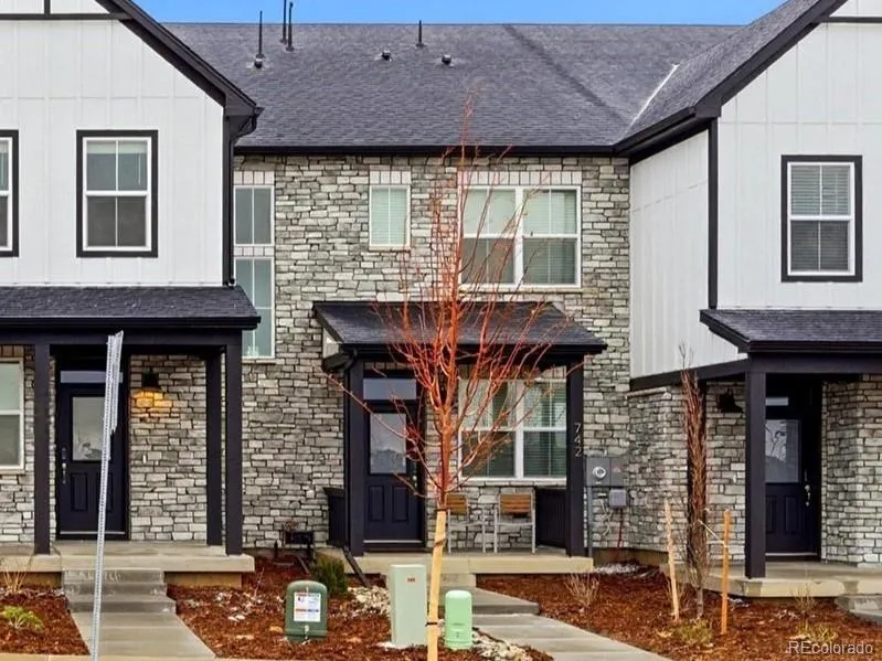 Open concept kitchen with quartz countertops and white cabinets! The Woodland is a stylish end-unit townhome featuring an open-concept main floor and a welcoming covered front porch. Upstairs offers a private primary suite with walk-in closet, plus two additional bedrooms and a versatile landing space. With 2.5 baths and a two-bay garage, this design blends comfort and functionality. The Meritage Home difference includes spray-foam insulation, advanced air filtration for year-round comfort and healthier air, and durable cementitious siding known for its strength, fire-resistance, and long-lasting performance. A Whirlpool appliance package, and full home blinds are also included for move-in convenience. Welcome home where every detail is built for comfort, efficiency, and LIFE. BUILT. BETTER. Horizon Uptown is a walkable, master-planned community in Aurora featuring parks, a dog park, and tennis courts. Located at I-70 and E-470, it offers quick access to Denver International Airport, downtown Denver, the Fitzsimons Innovation Community, the Denver Tech Center, and major entertainment destinations. *This home qualifies for special incentives through builder preferred lender for a limited time. Terms and conditions apply. See sales counselor for details! *This was a model home; any furniture is not included.