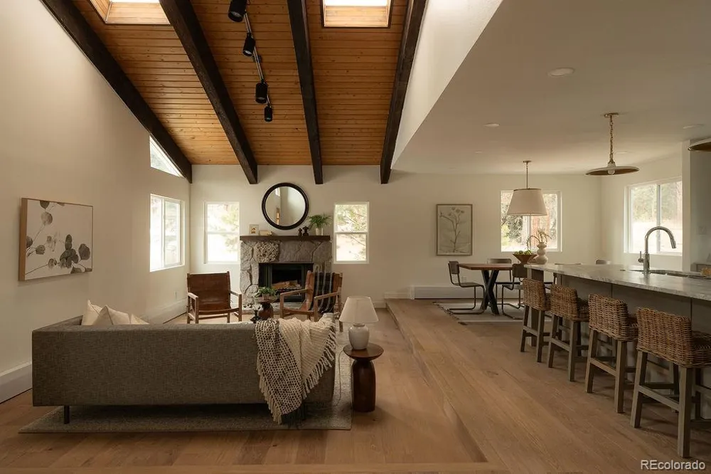 A thoughtfully curated mountain estate, this fully updated residence sits on two private, wooded acres with a south-facing driveway—blending designer luxury with peaceful seclusion just minutes from downtown Evergreen, schools and trails. Significant high-value upgrades provide sustainable luxury and long-term peace of mind, including fully paid solar panels, a new architectural-grade Class 4 hail resistant roof, and new high-efficiency windows. Inside, the open-concept heart of the home is framed by soaring vaulted wood ceilings and two majestic stone fireplaces. The chef-caliber kitchen is a true showstopper, featuring exotic leathered quartzite countertops, bespoke cabinetry with an artisan-crafted range hood, and pro-style stainless steel appliances. An oversized island and built-in pantry with roll-outs ensure effortless entertaining. The primary sanctuary offers vaulted wood ceilings, a spa-like en-suite bathroom with custom glass, a dedicated coffee bar, and a generous walk-in closet. A versatile loft space upstairs provides the ideal setting for a home office, while the lower level features a flexible suite space well-suited for a bedroom, a theatre room, or a home gym. Every square inch is revitalized with new flooring, solid-core doors, modern baseboard heating covers and designer finishes throughout. Step outside off the back deck to a sprawling 2-acre estate with a partially fenced yard and a premium TuffShed. The attached, oversized two-car garage with tall ceilings features extra loft storage for seasonal gear. Backed by a one-year craftsmanship warranty on all work completed, this is a rare turn-key opportunity to own a flawlessly updated mountain retreat.